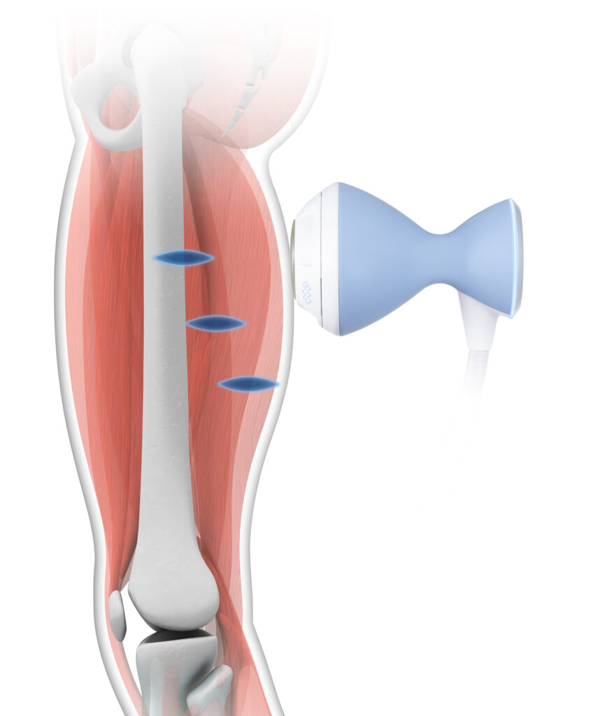 集束型体外衝撃波は音波エネルギーの一種で、筋肉、骨、靭帯や腱などの筋骨格系の組織に物理的な刺激を与えることで、疼痛緩和に繋がります。